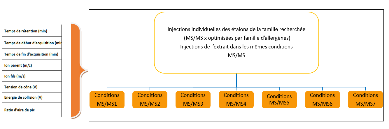 Elle repose sur l'extraction du gant au solvant, l'injection individuelle des étalons (solutions-filles) pour les allergènes appartenant à la famille recherchée, dans les conditons (MS/MS x) optimisées pour cette famille, et l'injection de l'extrait dans les mêmes conditions (MS/MS x).