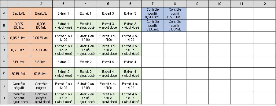 - Etablir le plan de distribution des échantillons dans la plaque de 96 puits et paramétrer le dosage des endotoxines à l’aide d’un logiciel dédié. Un exemple de plan de plaque pour 4 extraits de cassette passés purs et dilués au 1/10e est donné ci-dessous.