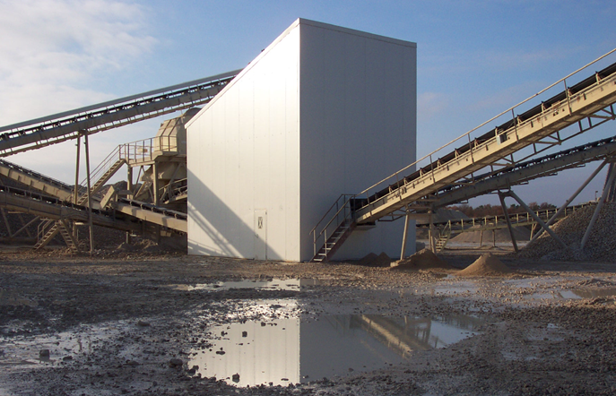L’abri du crible est mis à profit pour diminuer le bruit. La structure est conservée. Le bardage est remplacé par des panneaux acoustiques modulaires constitués d’une tôle pleine de 0,63 mm d’épaisseur, d’une laine de roche 100 kg/m3 d’épaisseur 60 mm et d’une tôle perforée à 25% de 0,63 mm d’épaisseur.