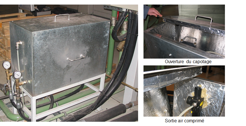 À partir des préconisations d’un spécialiste, l’entreprise a réalisé elle-même un encoffrement en tôle revêtu à l'intérieur de laine minérale haute densité. L’arrivée d’air est en dessous de l’encoffrement. La capotage s'ouvre pour donner accès aux machines..