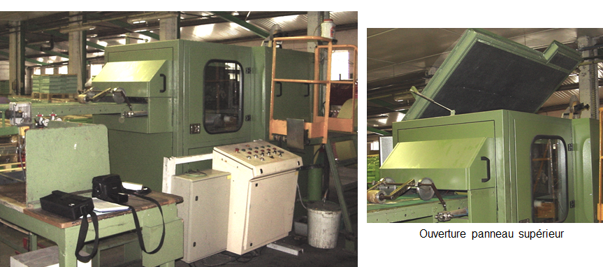 La machine a été encoffrée tout en gardant les ouvertures nécessaires à son fonctionnement. Ces ouvertures ont été réduites au minimum ou traitées afin de limiter au maximum les fuites acoustiques. Le toit de l'encoffrement s'ouvre pour que l'opérateur puisse intervenir en cas de bourrage.