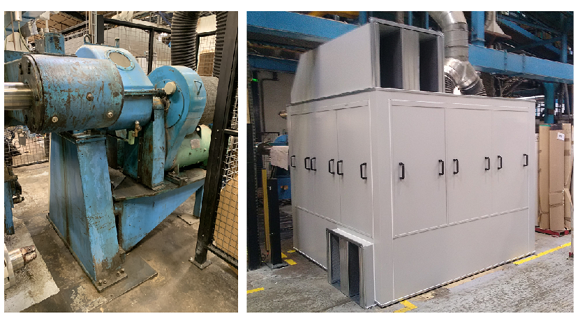 L’entreprise a fait installer un encoffrement acoustique qui englobe complètement les deux moteurs électriques et le réducteur. Ses dimensions principales sont L = 2,2 x l = 2,2 x H = 2,5 m. Il est constitué de panneaux démontables pour l’accès, le chargement et la maintenance. Un ventilateur avec un débit de 8 000 m³/h permet l’équilibrage thermique de l’enceinte. L’air entre par un silencieux en pied de machine. Le ventilateur est équipé d’un silencieux de refoulement disposé en plafond.