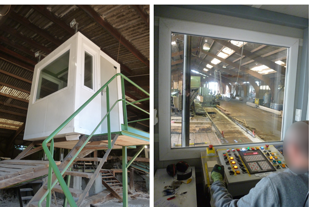 Les opérations de sciage des billes de bois pour les transformer en planches exposent l’atelier à des niveaux sonores supérieurs à 90 dB(A) durant toute la journée de travail. Le poste de pilotage de la ligne de découpe est situé dans une cabine réalisée par l’entreprise avec les matériaux à disposition (planches de bois, verre simple et porte isoplane). A l’intérieur de la cabine, les niveaux sonores sont de 80 à 85 dB(A) obligeant l’opérateur à porter des protecteurs individuels contre le bruit.