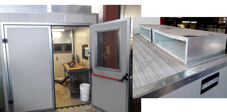 L’entreprise s’est dotée d’une cabine insonorisée dans laquelle seront testées les machines. Cette cabine comporte une double porte et sa vitre est en verre feuilleté. Sa structure est réalisée en panneaux de type sandwich incorporant de la laine minérale haute densité et perforés en face intérieure. La ventilation interne pour l'extraction des gaz d'échappement est assurée à l'aide d'un ventilateur placé à l'intérieur de la cabine, avec un rejet à l’extérieur des locaux. L'air est aspiré via un orifice d'admission doté d‘un silencieux et placé sur le plafond de la cabine.