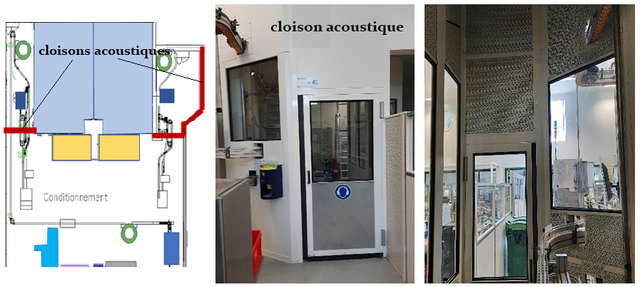 l'analyse de l'activité montre que les zones où évoluent les opérateurs pour la conduite des lignes se concentrent dans la partie conditionnement, donc à distance des sources les plus bruyantes comme le broyeur. L'entreprise a donc décidé de séparer ces sources de bruit du reste de la ligne de conditionnement par une cloison acoustique isolante dont la face intérieure (coté sources du bruit) est absorbante.