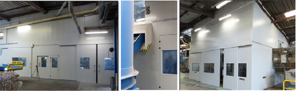Les deux lignes de recyclage ont été encoffrées. De nombreux accès ont été prévus au niveau de l’encoffrement pour la maintenance de la ligne (manutention et remplacement des moteurs notamment) et des vitres ont été installées pour permettre de surveiller l’installation sans pénétrer dans l’enceinte de l’encoffrement. Les murs de l’encoffrement acoustique sont constitués d’un complexe de tôle acier pleine laquée côté extérieur et laine minérale absorbante acoustiquement protégée par une tôle perforée côté intérieur.