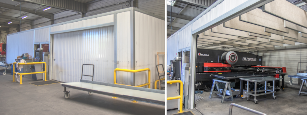 La poinçonneuse a été encoffrée par une enceinte verticale (L x l x h = 12,5 x 6,5 x 3 m) constituée de panneaux isolants et absorbants (tôle extérieure nervurée doublée à l'intérieur par une laine de roche d'épaisseur 60 mm protégée par une tôle perforée) et un plafond constitué de 70 baffles acoustiques (L x h = 2.5 x 0.5 m) suspendus à 2,5 m du sol. L'enceinte est équipée d’un oculus, d’une porte d’accès piéton vitrée et d'une grande ouverture rapide coulissante pour le passage des pièces.