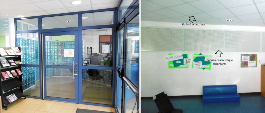 Rehausse de la cloison partielle par des vitrages jusqu’au faux-plafond et pose d’une cloison supplémentaire vitrée pour isoler l’espace bureau de la zone d'accueil des enfants. Réorganisation de la crèche pour déplacer les activités bruyantes loin des bureaux. Traitement acoustique de la zone où se déroulent ces activités.