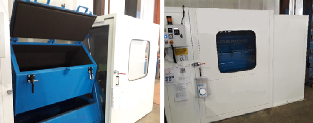 Afin d’éviter de réaliser cette opération de finition manuellement, l’entreprise a opté dans un premier temps pour l’achat d’un tonneau rotatif motorisé. Les pièces à traiter sont placées dans un tambour recouvert d’un média abrasif. Lors de la rotation du tonneau, la friction des pièces sur le media abrasif apporte le traitement souhaité (ébavurage, descoriage, décalaminage, finition/polissage). Malgré le revêtement caoutchouc protégeant et insonorisant le tambour, suivant les pièces à ébavurer, le niveau sonore peut dépasser les 90 dB(A). Afin de réduire le niveau sonore, l'entreprise a encoffré le tonneau. L'encoffrement est constitué de panneau sandwich perforés en face intérieur. L’accès se fait par une porte coulissante dotée d’une vitre de contrôle. Un asservissement n’autorise la rotation que si la porte est fermée.