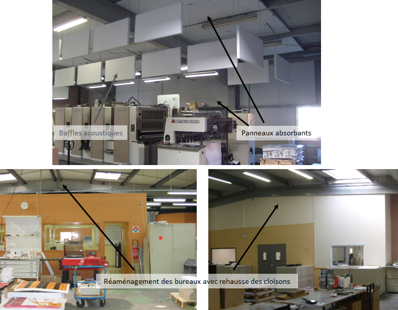 Le niveau sonore aux postes de chargement et de réception de la machine offset passe respectivement de 85,8 à 83,8 dB(A) et de 83,9 à 81,7 dB(A) soit un gain de 2 dB(A). Le niveau sonore dans les bureaux baisse de 65 à 51 dB(A).