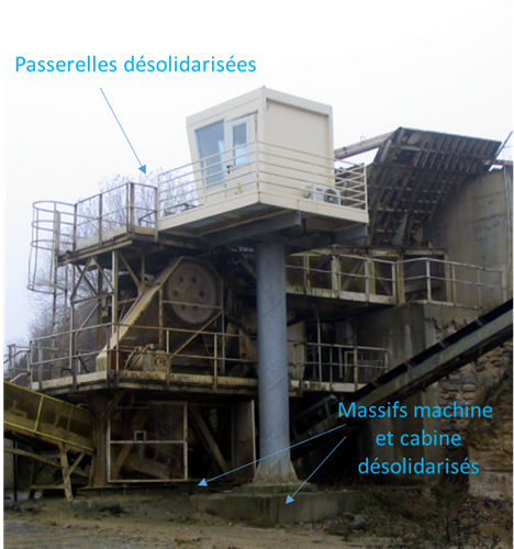 Une nouvelle cabine est mise en place, désolidarisée du concasseur et de sa structure porteuse. Elle repose sur un pylône ancré sur un massif séparé. La nouvelle cabine est constituée de parois en bardage double peau et de parties vitrées en double vitrage. Les passerelles machine et cabine sont également désolidarisées : il n’y a aucune liaison rigide entre la machine et la cabine.