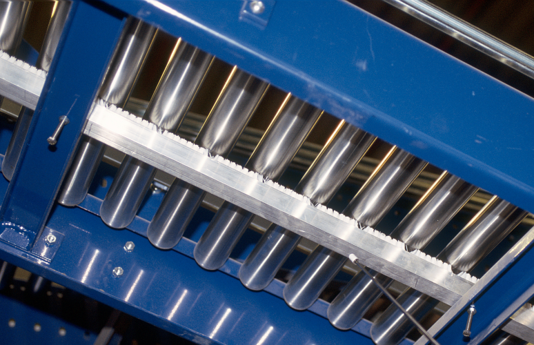 Une brosse a été fixée sous les convoyeurs. Elle est en contact avec les rouleaux de manière à freiner ces derniers après le passage du colis. Ainsi la durée pendant laquelle chaque rouleau du convoyeur est en rotation se trouve considérablement réduite par rapport à la situation initiale (rouleau non freiné).