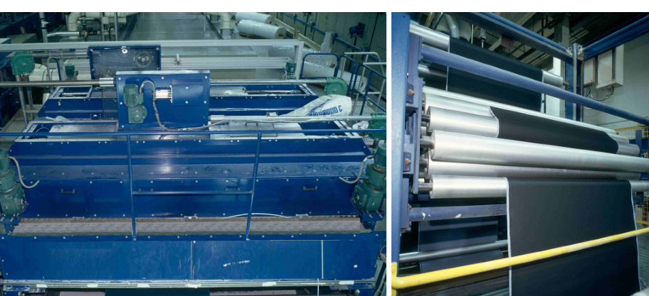 À l’occasion de l’approvisionnement d’une nouvelle machine, une modification de procédé est mise au point en concertation avec le fournisseur. La source dominante de bruit est constituée par les chocs lors du battage du tissu. Ce procédé est remplacé par un vibrage du tissu obtenu au moyen d'une série de poutres vibrantes indépendantes, montées avec isolation vibratoire sur le bâti de la machine.