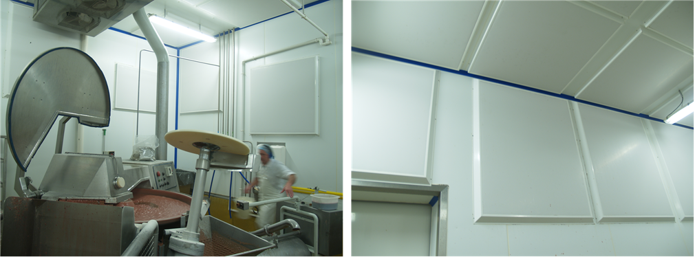 Les locaux agro-alimentaires sont très réverbérants. En effet pour des raisons d’hygiène toutes les parois sont constituées de carrelages, béton et panneaux sandwichs en tôle ou de revêtement polyester tous parfaitement lisses pour être nettoyables et ne pas faciliter le développement microbien.