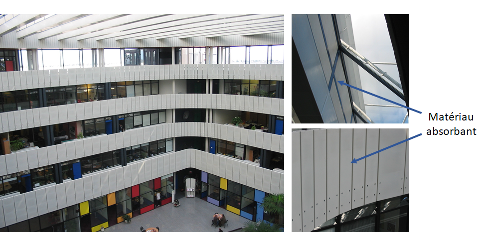Un établissement accueille le public dans un hall d’entrée de 18 000 m3 ; les bureaux sont ouverts sur les passages circulaires surplombant le hall (coursives). L’éclairage est assuré en lumière naturelle par un plafond vitré. Le volume important et la présence d’un plafond vitré sont des éléments défavorables car ils créent une réverbération importante. L’accueil du public et l’intelligibilité nécessaire dans les bureaux périphériques exigent au contraire que l'absorption acoustique soit la plus élevée possible dans le hall.