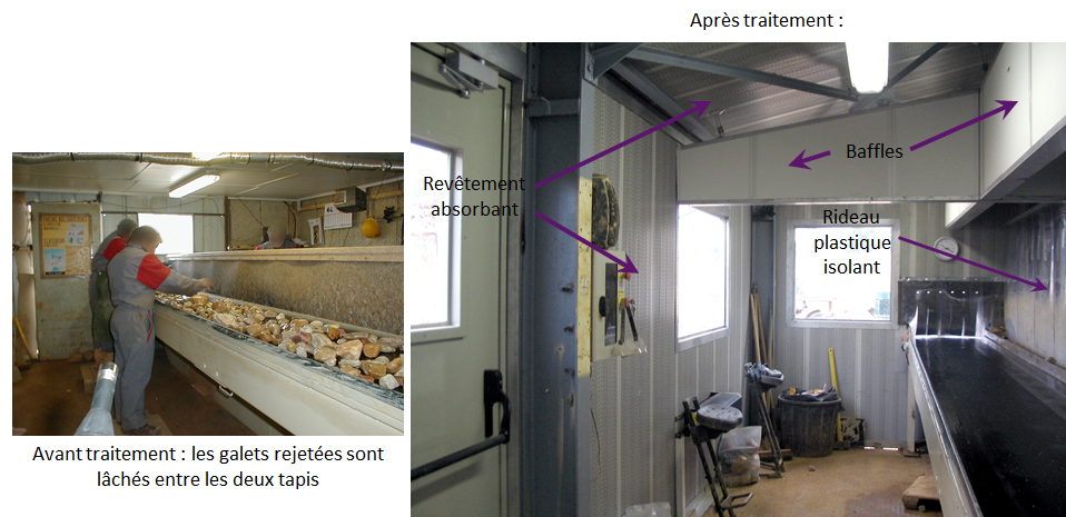 Les murs et le plafond du local ont été recouverts d'un revêtement acoustique absorbant constitué d'une laine minérale protégée par une paroi perforée. En complément, des baffles acoustiques verticaux ont été installés. La goulotte d'évacuation des galets rejetés a été isolée au moyen d'un rideau plastique.