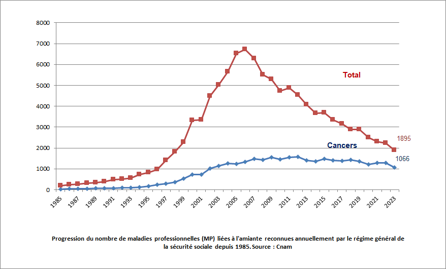 Progression du nombre de maladies professionnelles liées à l'amiante reconnues par le régime général de la Sécurité sociale depuis 1985