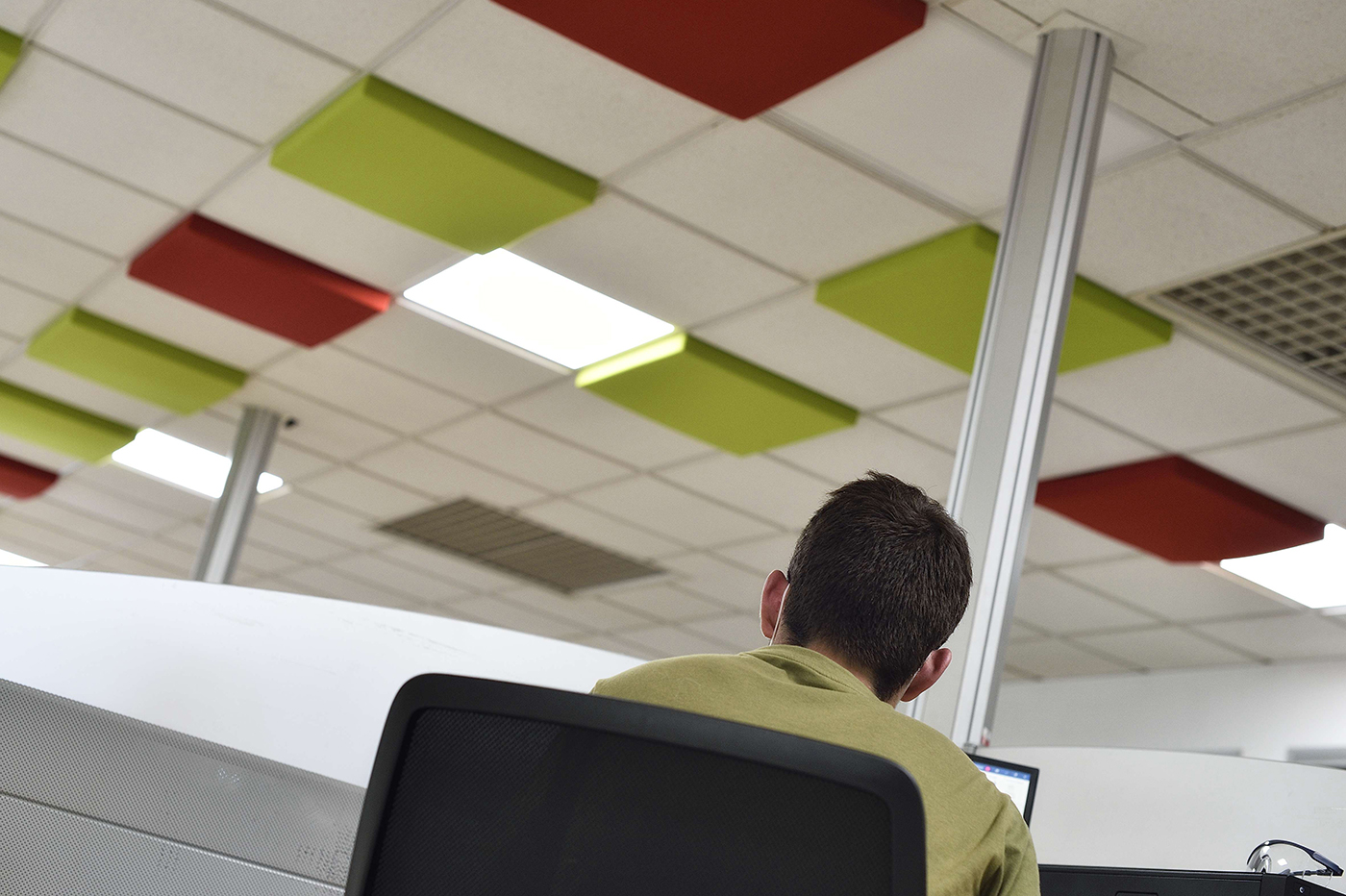 Plafond d’un bureau équipé de panneaux acoustiques