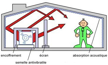On peut revêtir les parois du local – le plafond, mais aussi les murs et les cloisons – d'un matériau possédant la propriété d'absorber fortement le son. L'efficacité de cette technique est cependant limitée aux zones éloignées des sources de bruit. Elle ne permet donc pas de réduire le bruit aux postes de travail de machines bruyantes.