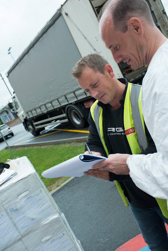 Un chauffeur signe le protocole lors d'une livraison de peinture.