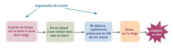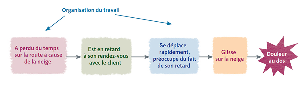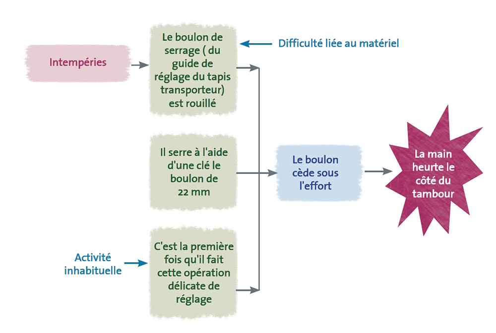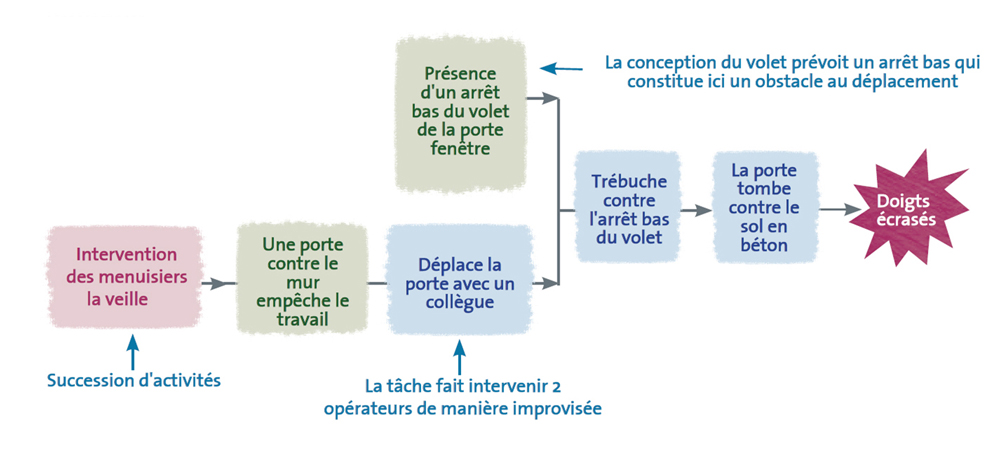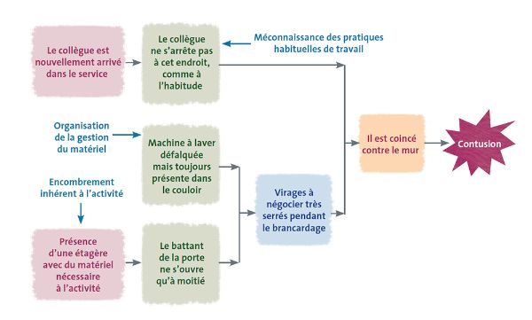 Lorsque les facteurs d’accident liés à l’environnement matériel, qui sont visibles et présents de manière quasi permanente dans la situation (sol en mauvais état, accès difficile pour l’opérateur de maintenance aux pièces d’une machine, présence, depuis 6 mois dans un couloir, d’un matériel destiné au rebus, neige ou verglas…) ont été neutralisés, il peut subsister un risque inhérent au déroulement de l’activité. Il est alors nécessaire d’engager des actions neutralisant d’autres types de facteurs souvent ignorés et pourtant également nécessaire, voire suffisant à la survenue de l’accident : l’urgence, la fatigue, la charge de travail, le manque d’expérience ou d’ancienneté dans le métier, l’organisation des tâches …
