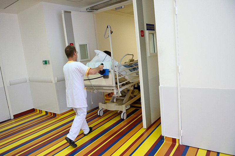 L’un des deux brancardiers, nouvellement arrivé dans le service, ne s’est pas arrêté à l’entrée de la salle de réveil, comme le faisaient habituellement ses collègues. L’autre brancardier s’est alors trouvé coincé entre le brancard et la porte et a été victime de contusions.