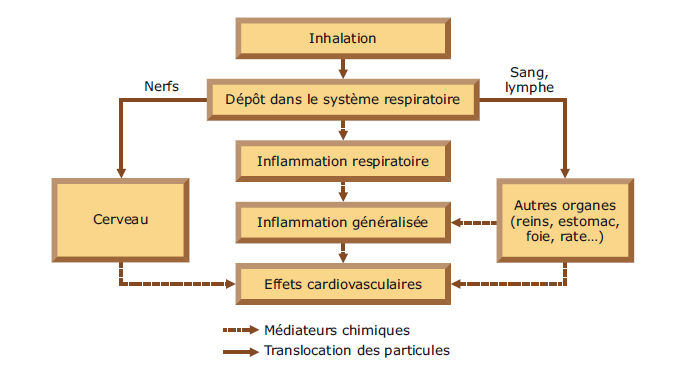 D’après les résultats des études expérimentales certains nanomatériaux inhalés sont de surcroît capables de traverser la paroi alvéolaire, migrer vers la plèvre, les structures ganglionnaires, rejoindre les systèmes sanguin et lymphatique et atteindre différents organes comme le foie, le cœur ou la rate. Ils peuvent également dans certains cas traverser la muqueuse nasale et être transportés via les nerfs jusqu’au cerveau.