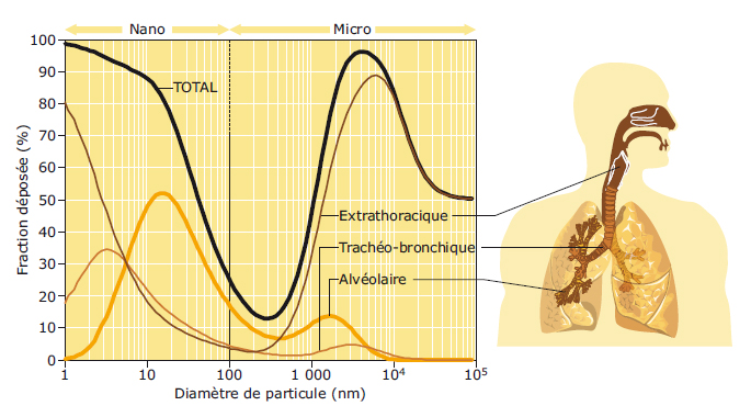 En milieu professionnel, l’inhalation constitue la principale voie de pénétration des nanomatériaux dans l’organisme humain. Une fois inhalés, les nanomatériaux peuvent soit être exhalés, soit se déposer dans les différentes régions de l’arbre respiratoire que sont les voies aériennes supérieures (les fosses nasales, la bouche, le pharynx et le larynx), l’arbre trachéo-bronchique (la trachée, les bronches et les bronchioles) et les alvéoles pulmonaires. Ce dépôt n’est généralement pas uniforme dans l’ensemble des voies respiratoires : il varie considérablement en fonction du diamètre, des degrés d’agrégation et d’agglomération ainsi que du comportement dans l’air des nanomatériaux. Les particules de diamètre compris entre 10 et 100 nm se déposent ainsi majoritairement dans le poumon profond (au niveau des alvéoles pulmonaires), dans une proportion nettement supérieure à celle des particules micrométriques. Les particules plus petites, quant à elles, se déposent principalement dans les voies aériennes supérieures et, dans une moindre mesure, dans la région trachéo-bronchique. La pénétration des nanomatériaux par voie respiratoire est plus importante à l’effort, ainsi que chez les sujets présentant une altération des fonctions pulmonaires (personnes souffrant de bronchite chronique…).