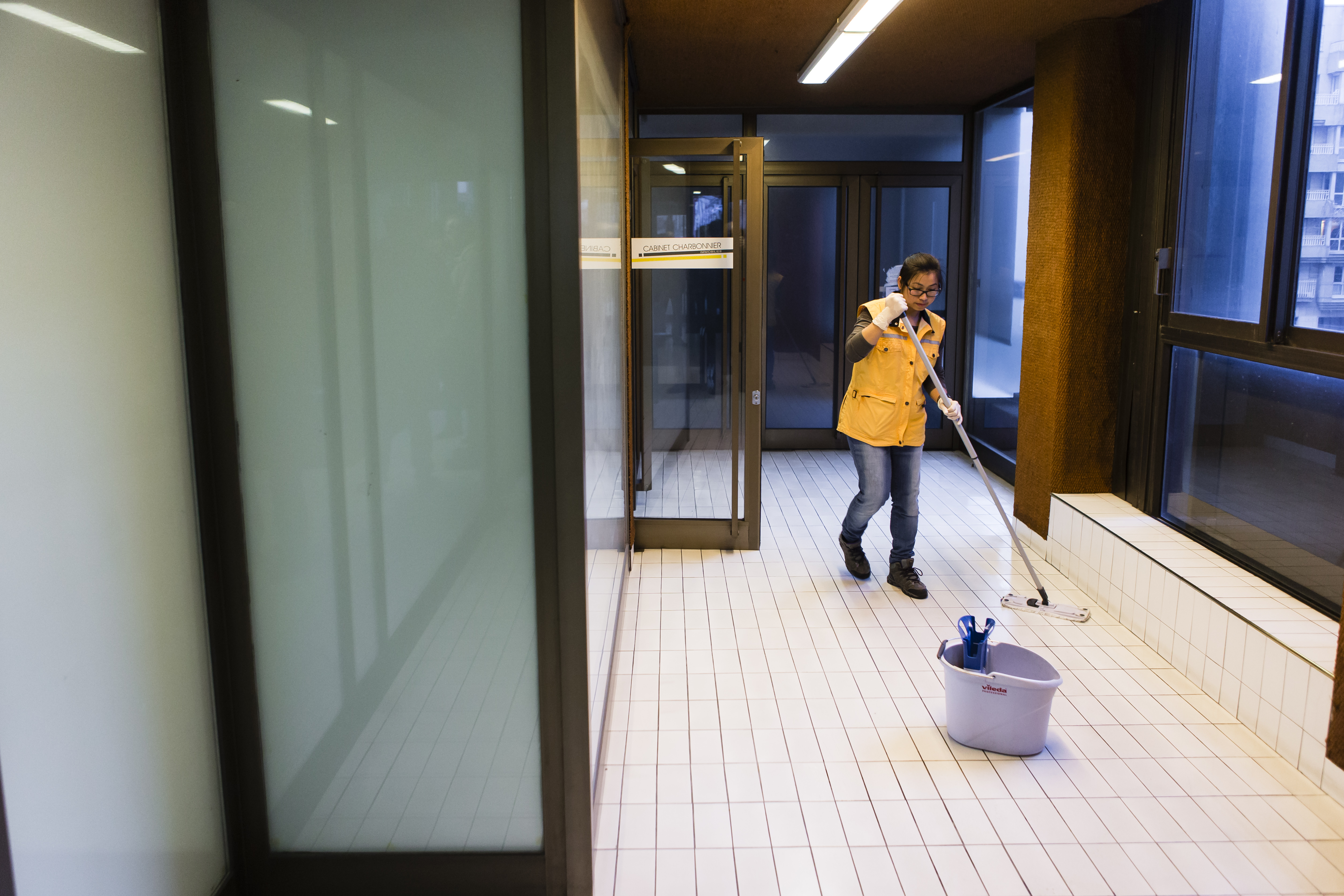 Madame M., technicienne de surface pour une entreprise de ménage pour des bureaux et des commerces.